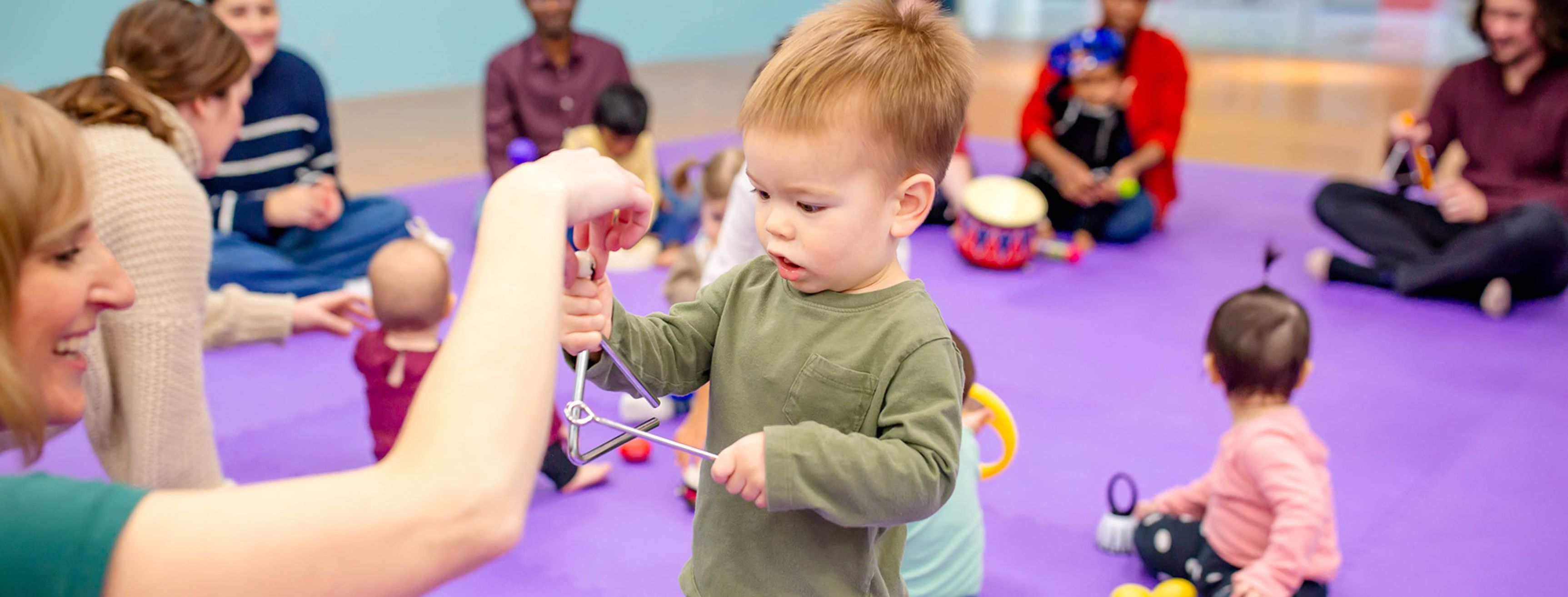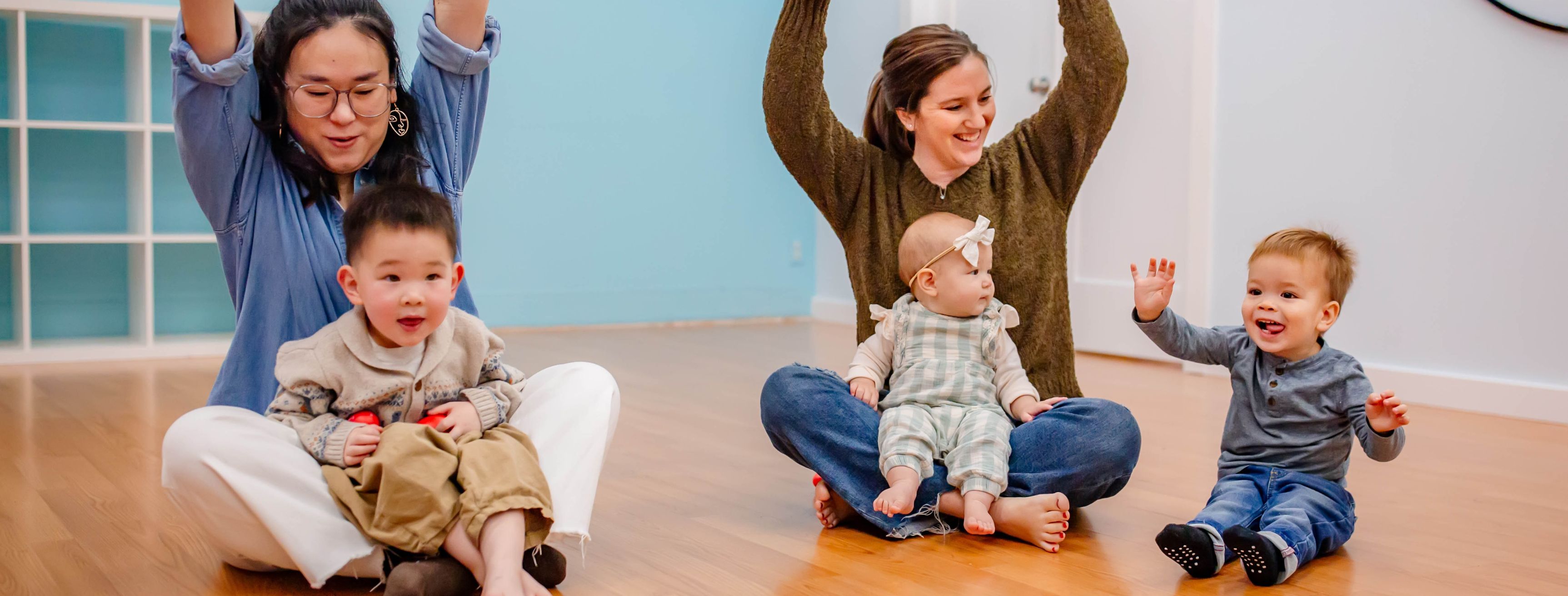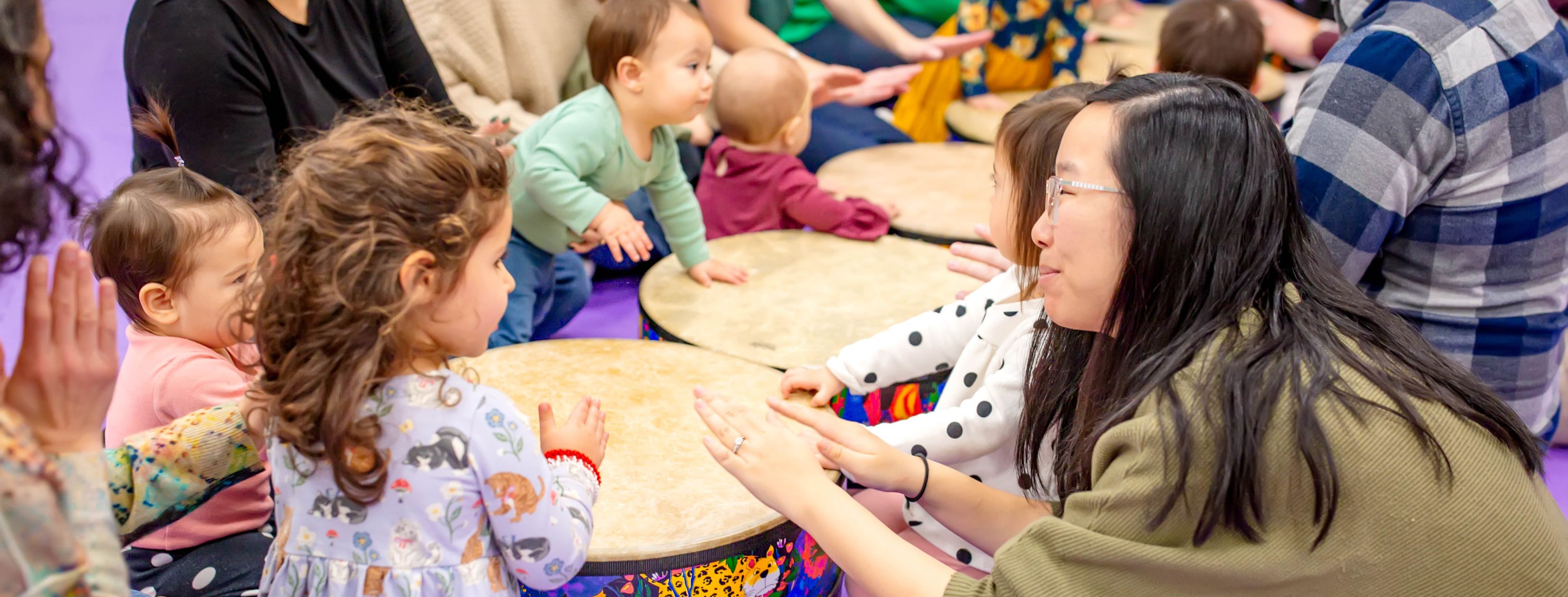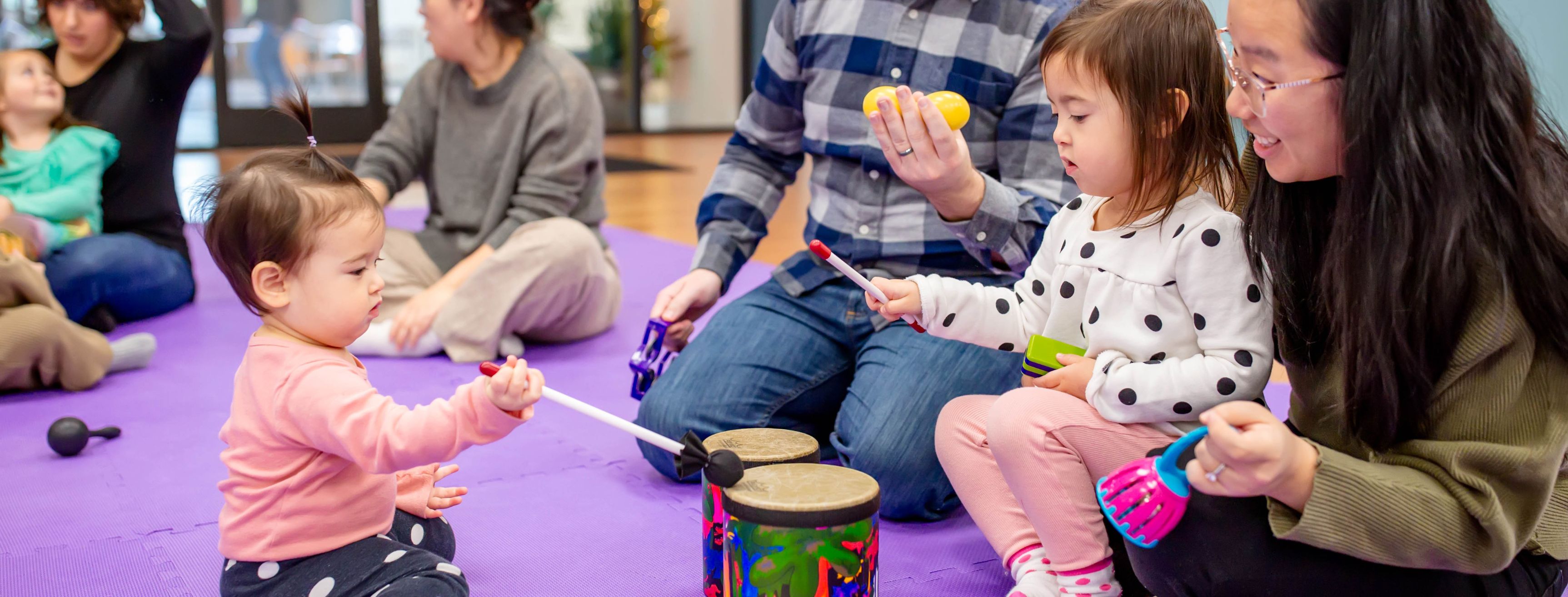 Fully trained, registered Music Together teachers lead groups of six to twelve children and their parents or caregivers (nannies, babysitters, grandparents, or relatives) in forty-five minutes of music and movement experiences.